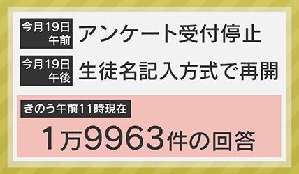 それを受け、4月19日にアンケート受付を停止、改めて生徒名記入方式で再開され4月25日午前11時現在で1万9963件の回答があるということです。埼玉県の教育委員会は、勧告に対する措置を8月に報告するとしています。