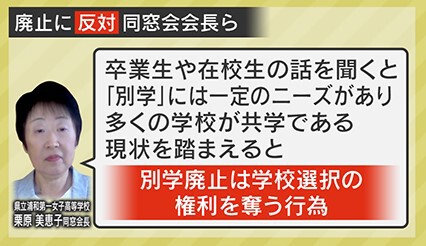 別学廃止に反対の県立浦和第一女子高等学校・栗原美恵子同窓会長は「埼玉県にはすでに共学校がたくさんある環境の中に少数の別学校が配置されている状況は、多様な選択肢の中から選べるという非常に好ましい状況。卒業生や在校生の話を聞くと、『別学』には一定のニーズがあり、多くの学校が共学である現状を踏まえると、別学廃止は学校選択の権利を奪う行為」と話しています。