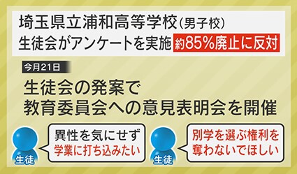 男子校の埼玉県立浦和高等学校で生徒会がアンケートを実施した結果、約85%が廃止に反対 だったということです。4月21日には、生徒会の発案で教育委員会への意見表明会を開催し、生徒の「異性を気にせず学業に打ち込みたい」や「別学を選ぶ権利を奪わないでほしい」などという声を伝えました。