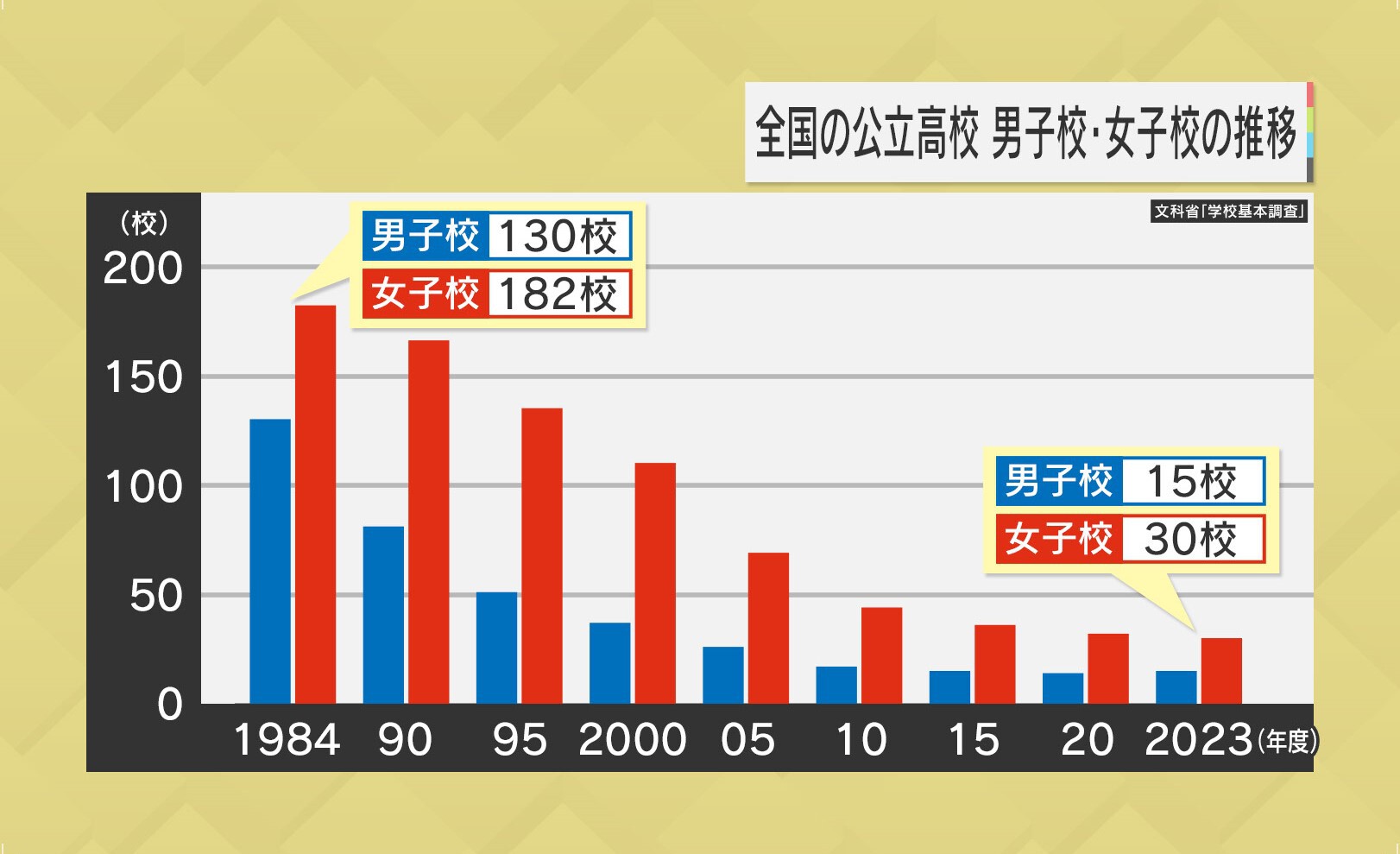 全国の公立高校での男子校・女子校の推移ですが、男・女別学の公立高校は急激に減っています。