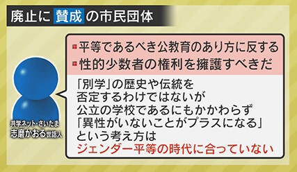 別学廃止に賛成の市民団体の教学ネット・埼玉・志磨かおる世話人は、「今の時代は、税金を使っている公共の学校として一方の性の入学を認めないというのはおかしい。平等であるべき公教育のあり方に反する。性的少数者の権利を擁護すべきだ」としたうえで「『別学』の歴史や伝統を否定するわけではないが、公立の学校であるにもかかわらず、『異性がいないことがプラスになる』という考え方はジェンダー平等の時代に合っていない」と話しています。