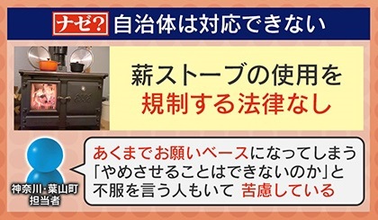 ただ、薪ストーブの使用を規制する法律はなく、神奈川・葉山町の担当者は、「あくまでお願いベースになってしまう。『やめさせることはできないのか』と不服を言う人もいて、苦慮している」と話しています。