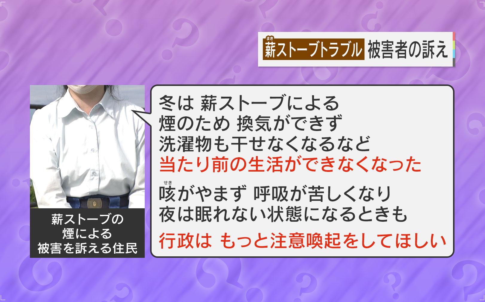 「私のところにも、何人かから問い合わせが来たり、町役場のほうにもクレームの電話も来ているみたいです。町のホームページ上でも薪ストーブの問題を提起したりとか、対策をしていますが、それだけでは解決していないという現状です」