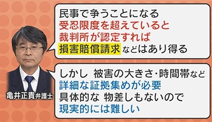 弁護士・亀井正貴氏によると、「民事で争うことになる。受忍限度を超えていると裁判所が認定すれば、損害賠償請求などはあり得る。しかし、被害の大きさ・時間帯など、詳細な証拠集めが必要。具体的な物差しもないので、現実的には難しい」ということです。