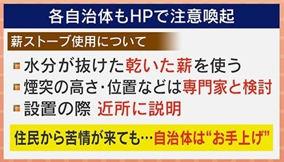 このほか、愛知・名古屋市や茨城・土浦市、福島・須賀川市など、数多くの自治体が薪ストーブの使用に関する注意喚起を行っています。