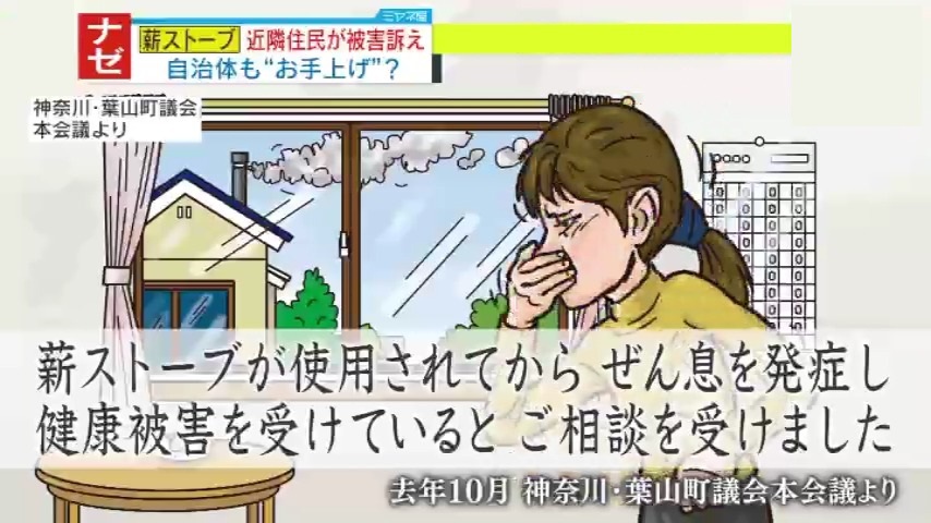 葉山町によると、薪ストーブとの因果関係は明らかになっていません。ただ、『ミヤネ屋』が取材した体調不良などの被害を訴えている住民は、「冬は、薪ストーブによる煙のため換気ができず、洗濯物も干せなくなるなど、当たり前の生活ができなくなった。咳がやまず、呼吸が苦しくなり、夜は眠れない状態になるときも。行政はもっと注意喚起をしてほしい」と話していました。