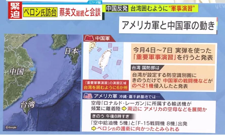 一方、中国の王毅外相は談話を発表し、「台湾問題でトラブルを起こし、挑発することは全くの徒労であり、必ず頭を割られて血が流れる」とアメリカを強く非難しています。さらに中国軍は、8月4日~7日まで、実弾を使った「重要軍事演習」を行うと発表。6か所の演習区域は台湾を取り囲むように設定され、船舶や航空機の通行を禁じるとしています。