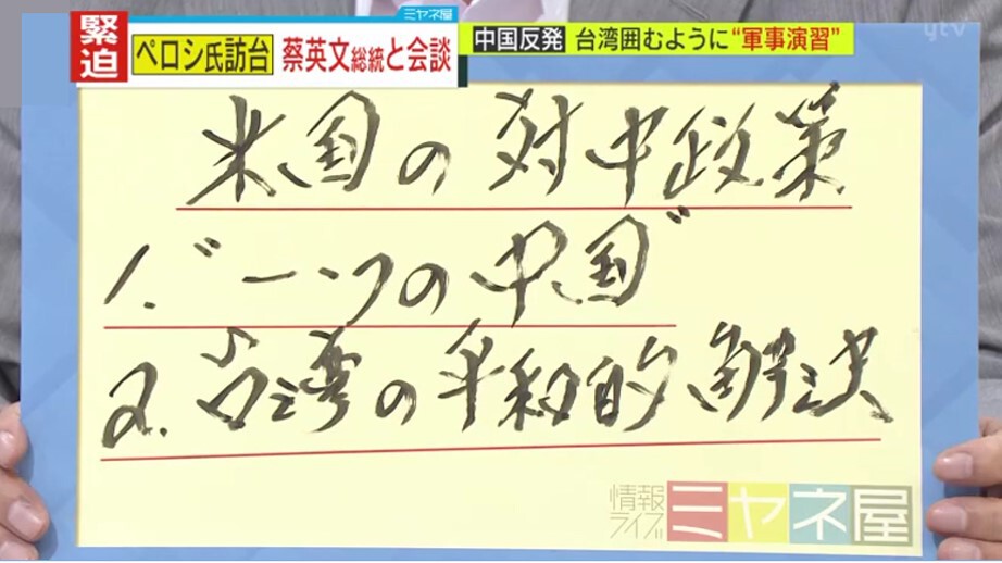 「私が長くホワイトハウスで取材している感じから言うと、それはあくまでも建前で、バイデン大統領とペロシ下院議長は与党同士ですし、相当水面下で緊密にちゃんと話をしていると思います。バイデン大統領が政権の座に就くときには、バイデン民主党の綱領があって、それに同意をしているので、その点で中国政策のような大事な物については、両者の間にはちゃんと表側があっています。バイデン大統領とペロシ下院議長の政策にそんなに違いがなく、つまり『台湾の平和的解決』と言って武力の行使については曖昧にしておくという政策だったのが大きく変わり始めています。中国はそれを問題にしているだけではなくて、“ワン・チャイナ・ポリシー”が崩れてきているのだと言っているのです」
