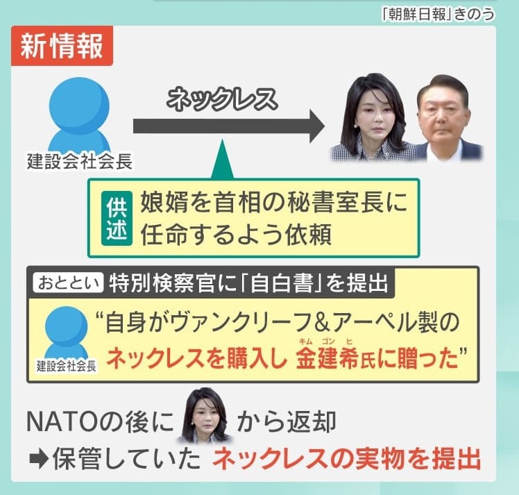 そして、そのネックレスについて、新たに、建設会社会長がキム夫人にネックレスを贈り、その見返りとして、娘婿を首相の秘書室長に任命するよう依頼していたという情報が出てきました。2025年8月11日、建設会社会長は特別検察官に自白書を提出していて、“自身がヴァンクリーフ&アーペル製のネックレスを購入し、キム夫人に贈った”という内容でした。NATOの晩さん会のあとにキム夫人から返却されていて、保管していたネックレスの実物も提出しているといいます。