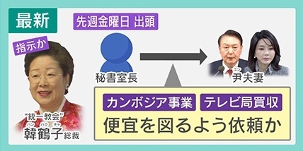 さらに、一部の疑惑を巡って取り沙汰されているのが、世界平和統一家庭連合、いわゆる“統一教会”の関与です。2025年8月8日には秘書室長が出頭しています。“統一教会”の韓鶴子(ハン・ハクチャ)総裁から指示を受けたと見られていて、カンボジア事業やテレビ局買収に便宜を図るよう、ユン夫妻に依頼したと見られています。