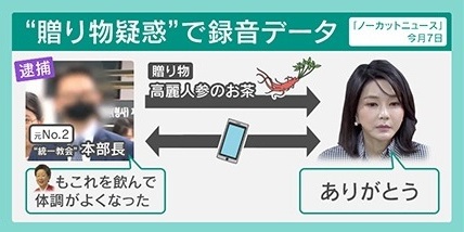 新たに録音データが出てきています。“統一教会”元ナンバー2の本部長は逮捕されていますが、贈り物として、キム夫人に高麗人参のお茶を贈ったといいます。そのやりとりの中で、本部長が「ハン・ハクチャ総裁もこれを飲んで体調がよくなった」と話し、キム夫人が「ありがとう」と返している録音データが見つかったということです。