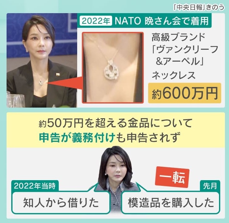 さらに、2022年にNATOの晩さん会で着用した高級ブランド『ヴァンクリーフ&アーペル』のネックレスは約600万円で、韓国では50万円を超える金品について、申告が義務づけされていますが、申告されていませんでした。2022年当時は知人から借りたと釈明していましたが、2025年7月には一転して「模造品を購入した」と話しています。