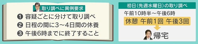 取り調べでキム・ゴンヒ氏は、『容疑ごとに分けて取り調べをしてほしい』『日程の間に3~4日間の休養が欲しい』『午後6時までに終了すること』と異例の要求をしています。初日の取り調べは10時半から午後6時までで、休憩は午前1回、午後は3回取り、その後帰宅しているということです。