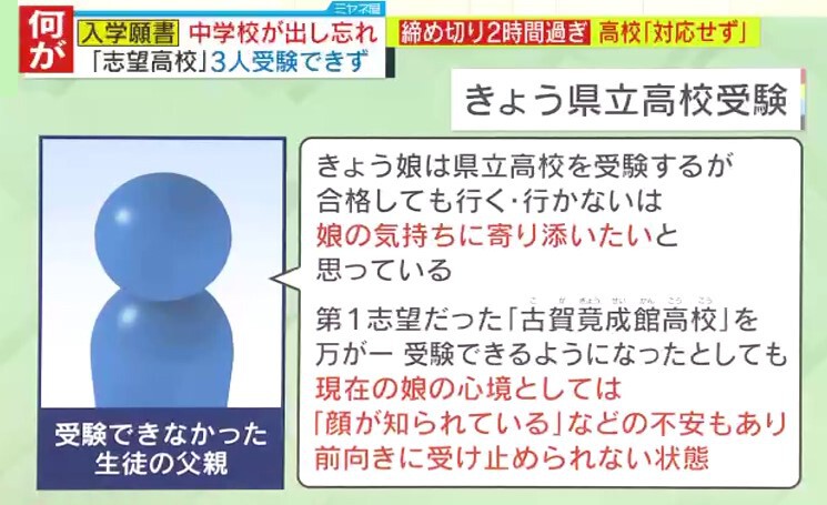 「本人は第1志望に行くために1年間頑張ってきて。でも、もう選択肢がなくなったので、何とかそこは切り替えて違う高校に行ってほしいとは思っているんですけど、本人がまだ現実を受け止められていないというのが事実です」