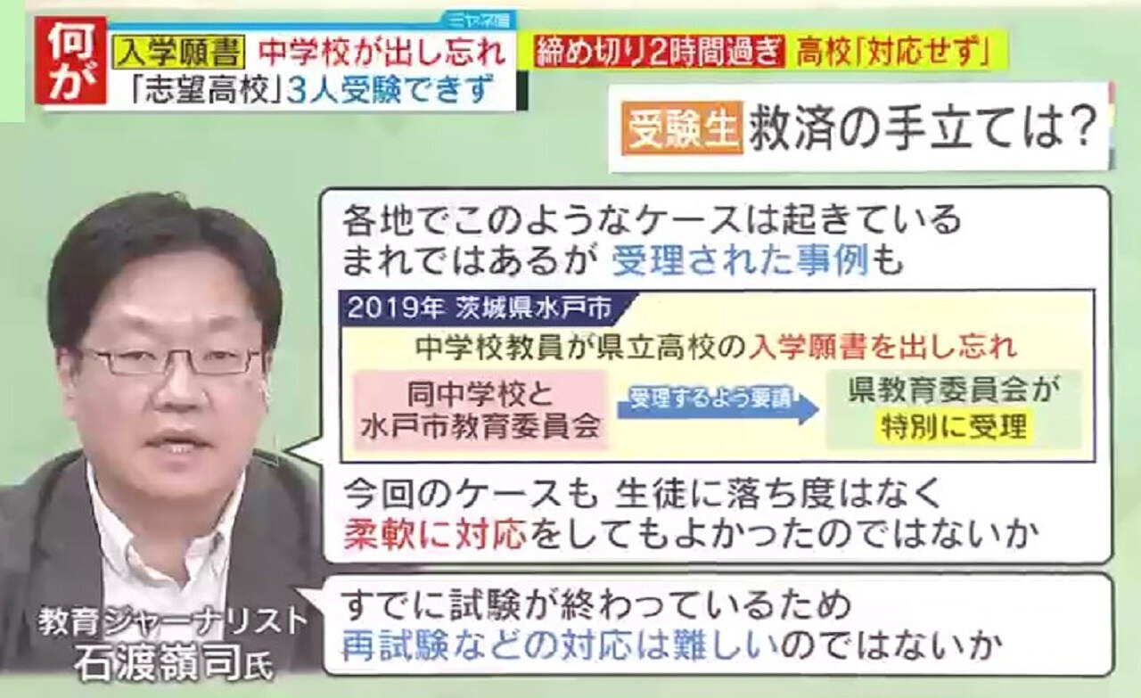 教育ジャーナリスト・石渡嶺司氏によると、「各地で、このようなケースは起きている。まれではあるが、受理された事例もある」ということです。茨城・水戸市では2019年、中学校教員が県立高校の入学願書を出し忘れましたが、同中学校と水戸市教育委員会が県教育委員会に受理するよう要請したところ、特別に受理されました。石渡氏は、「今回のケースも生徒に落ち度はなく、柔軟に対応してもよかったのではないか」と話していますが、「すでに試験が終わっているため、再試験などの対応は難しいのではないか」ということです。
