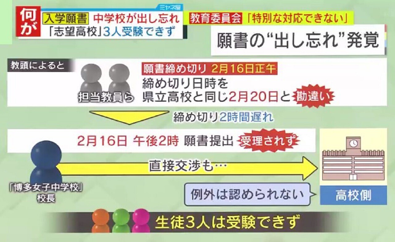 福岡市東区の私立「博多女子中学校」の生徒3人は、2市1町が組織する学校組合が設置した“組合立”の高校・公立「古賀竟成館(こがきょうせいかん)高校」を志望していました。願書の締め切り日は「古賀竟成館高校」が2月16日正午、県立高校が2月20日正午でしたが、担当教員らは「古賀竟成館高校」の締め切り日も県立高校と同じ2月20日だと勘違いしていたといいます。2時間遅れである2月16日午後2時に願書を提出しましたが受理されず、校長が高校側に直接交渉するも「例外は認められない」として、生徒3人は受験できませんでした。