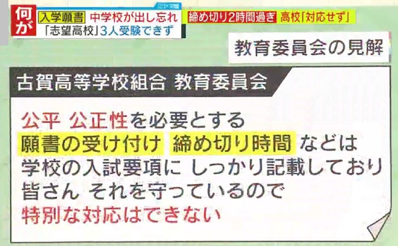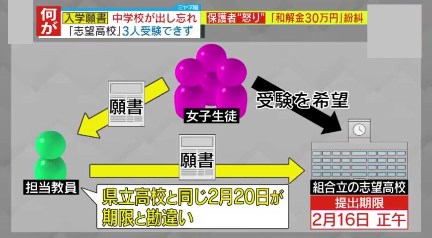 願書を出し忘れられたのは、3人の3年生。2市1町が組織する“組合立”高校の受験を希望し、中学校を通じて願書を提出する予定でした。提出期限は2月16日正午でしたが、担当教員らは、県立高校と同じ2月20日が期限だと勘違いしていました。16日午後2時になって高校に願書を届けましたが、「期限を2時間過ぎた」として受理されず、校長が高校側に直接交渉したものの、「例外は認められない」と生徒3人は入学試験を受けられませんでした。