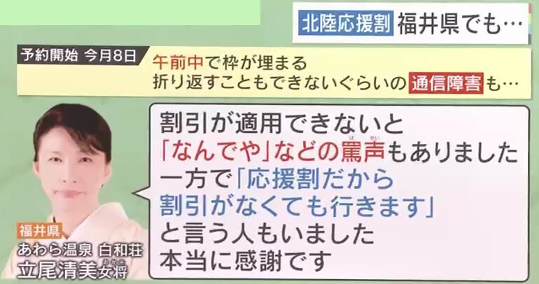 福井県にある「あわら温泉 白和荘」でも、予約開始日の午前中で枠が埋まり、折り返すこともできないぐらいの通信障害になりました。女将の立尾清美さんは、「割引が適用できないと『なんでや』などの罵声もありました。一方で『応援割だから、割引がなくても行きます』と言う人もいました。本当に感謝です」と話しています。