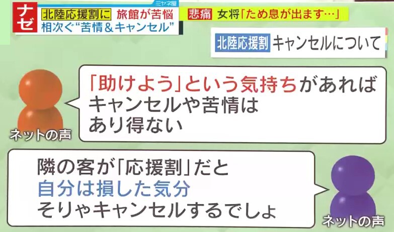 こうした状況にネット上では、「『助けよう』という気持ちがあれば、キャンセルや苦情はあり得ない」「隣の客が『応援割』だと、自分は損した気分に。そりゃキャンセルするでしょ」など賛否両論が巻き起こっています。