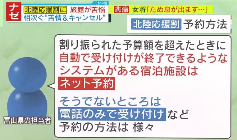予約方法については、富山県の担当者によると「割り振られた予算額を超えたときに自動で受け付けが終了できるようなシステムがある宿泊施設は、ネット予約。そうでないところは電話のみの受付など、予約の方法は様々」だということです。