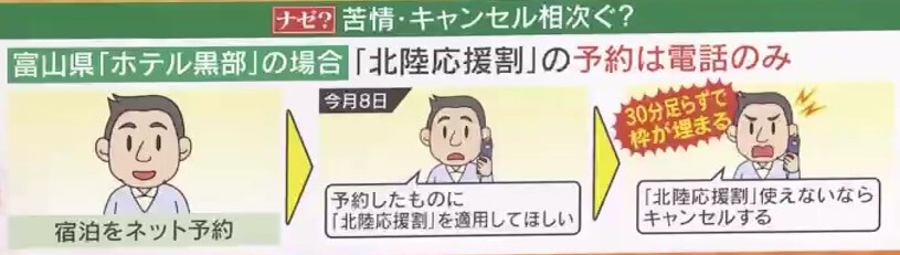 富山県にある『ホテル黒部』の場合、『北陸応援割』の予約は電話のみで受け付けていました。しかし、キャンペーン期間前にネット予約をした人が、キャンペーンが始まった後に「予約したものに『北陸応援割』を適用してほしい」と電話してきて、30分足らずで枠が埋まったとホテル側が断ると、「『北陸応援割』を使えないならキャンセルする」と言う人が相次いだといいます。