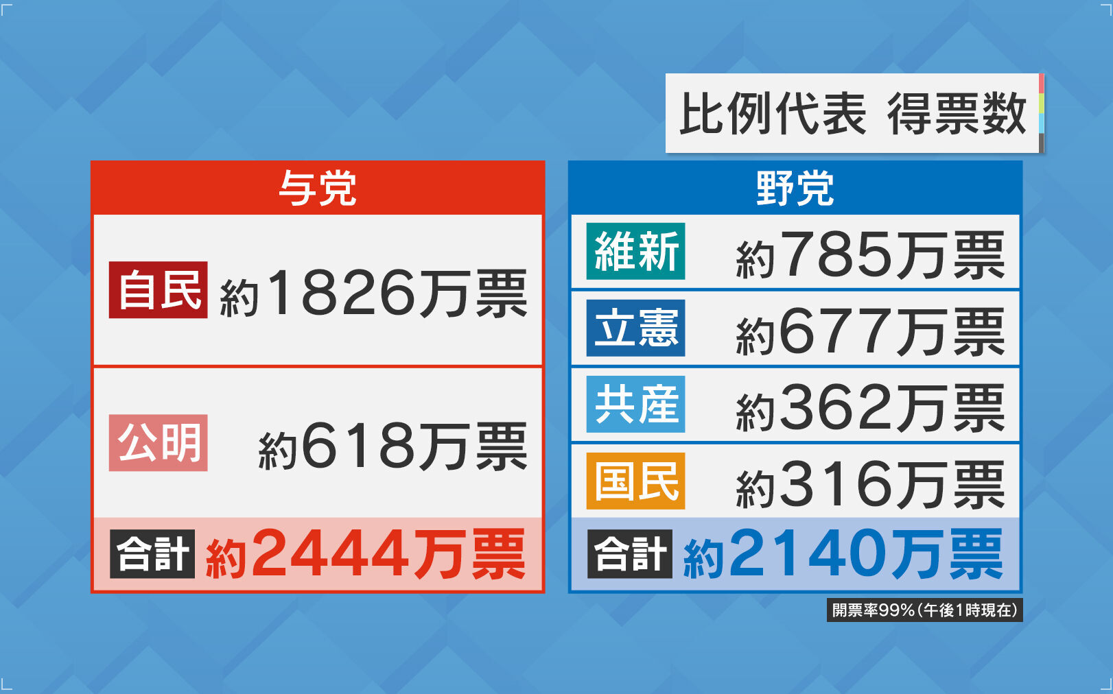 しかし、比例代表の得票数は、与党が約2444万票に対して野党が約2140万票と、選挙区の議席数に比べその差は少なくなっています。