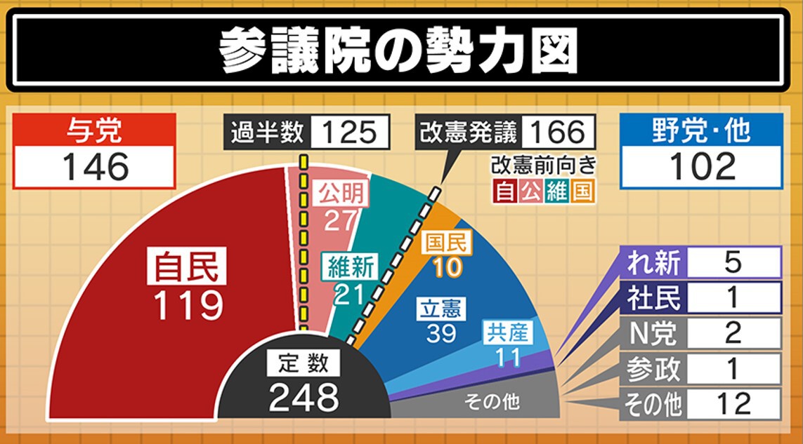 参議院の定数248議席のうち、与党の自民党と公明党合わせて146議席と、過半数の125議席を超えました。また自民・公明に日本維新の会、国民民主党を加えた“改憲勢力”も、改憲に必要な定数の3分の2を超える166議席を獲得しています。また、32ある「1人区」の結果を見てみても、自民党28議席に対して野党4議席と、与党の圧勝でした。