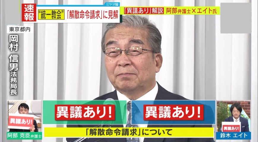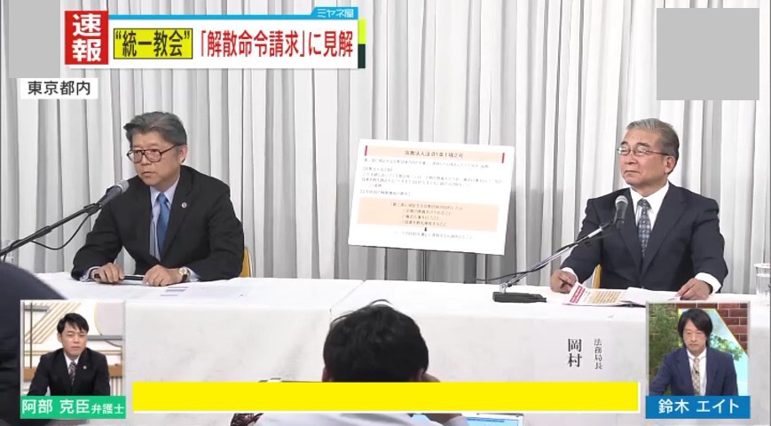 政府の「解散命令請求」を受け、“統一教会”が10月16日に会見を行い、岡村信男法務局長と福本修也弁護士の二人が登壇しました。政府の決定を「痛恨の極み」と表現した教団、一体何を訴えたのでしょうか。ジャーナリスト・鈴木エイト氏、救済活動に尽力してきた阿部克臣弁護士の解説です。