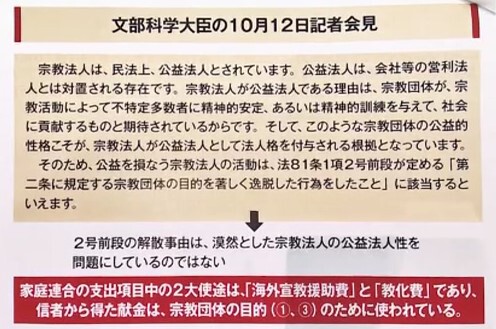 「はい。教団の主張は、『家庭連合の支出項目中の二大使途は、『海外宣教援助費』と『教化費』であり、信者から得た献金は宗教団体の目的①と③のために使われているため目的逸脱じゃない』、ということだと思いますが、文化庁は13日の段階で、きちんと具体的な行為を挙げて、法人の目的は『金銭獲得目的だった』と詳しく書いています。ですから、文化庁は漠然とした抽象的なことを言って逸脱を認定しているわけでは全くないです」