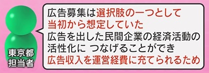 東京都の担当者によると、「広告募集は選択肢の一つとして、当初から想定していた。広告を出した民間企業の経済活動の活性化につなげることができ、広告収入を運営経費に充てられるため」としています。