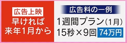 広告の上映は、早ければ2025年1月から。広告料の一例としては、1月の1週間プランは15秒×9回で74万円です。夏場は日照時間が長く上映回数が少ないため少し安くなるなど、月によって料金が変わるといいます。