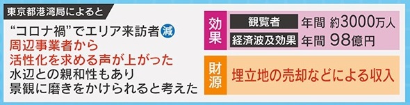 東京都によると、観覧者は年間約3000万人・経済波及効果は年間98億円。財源は税金ではなく、埋立地の売却などによる収入から捻出するということです。
