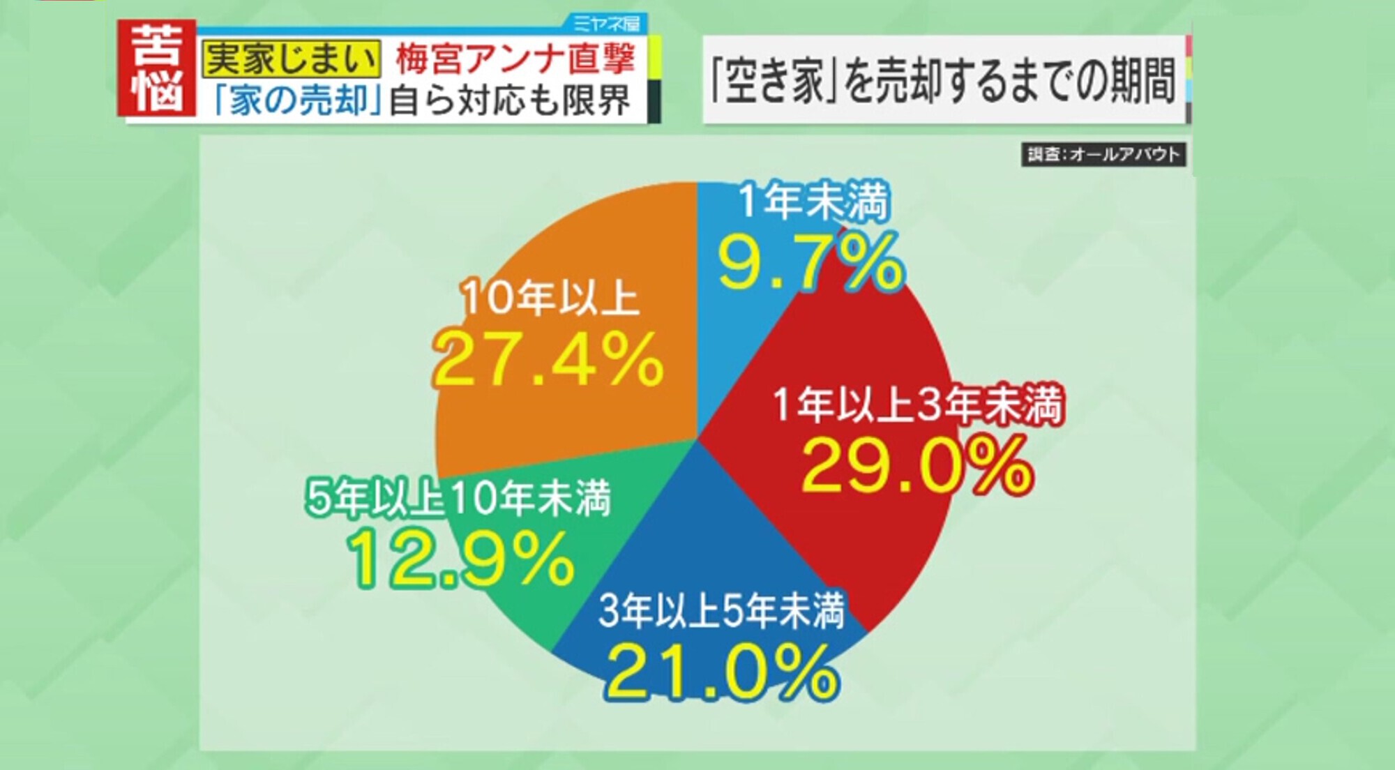 ネットメディアが調査した、「空き家」の売却までにかかった期間は、1年未満はわずか9.7%で、3年以上かかったケースは60%を超えています。「実家じまい」の際には、まず“買い手”を見つける難しさが大きな壁となりますが、アンナさんの場合は…