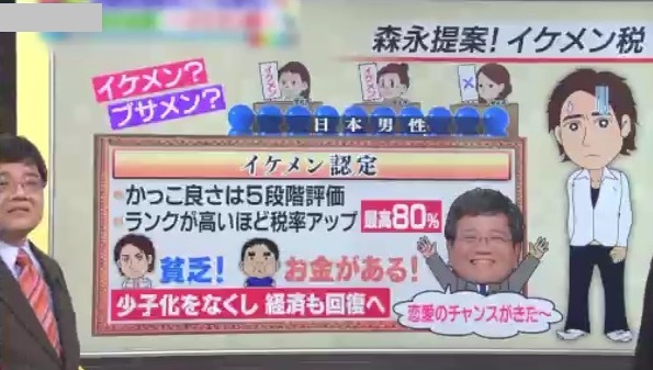 「イケメン税というのを導入して、イケメン審査会がカッコよさを5段階評価します。イケメンからは、ごっそり税を取ってですね…」