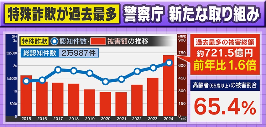 特殊詐欺が過去最多となり、警察庁が新たな取り組みを行っています。画像の青いグラフが特殊詐欺の認知件数で、赤いグラフが被害額の推移となっていて、2024年は過去最多の被害総額約721.5億円以上、前年比は1.6倍で、1日約2億円の被害額ということになります。特に高齢者の被害が多く、65.4%になるといいます。