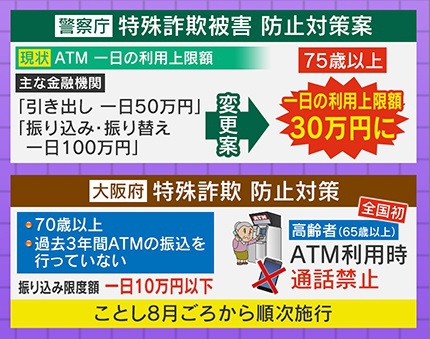 警察庁は色々な特殊詐欺被害の防止対策案を出していて、例えば、ATMの一日の利用上限額は、現状、主な金融機関だと『引き出し 一日50万円』で『振り込み・振り替え 一日100万円』となっています。そして変更案では、75歳以上の高齢者の方は一日の利用上限額を30万円にしていきたいとのことです。