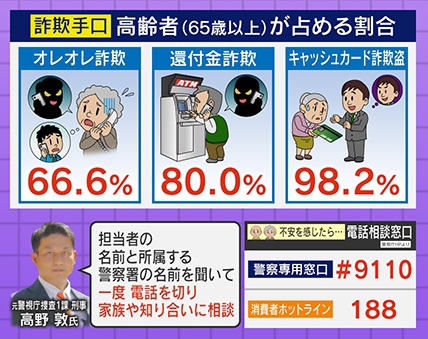 詐欺手口別に高齢者(65歳以上)が占める割合を見ると、『オレオレ詐欺』は66.6%で、『還付金詐欺』は80.0%、『キャッシュカードの詐欺』に関しては98.2%となっています。こうした詐欺に遭わないために、電話がかかってきた際、高野氏によると「担当者の名前と所属する警察署の名前を聞いて一度電話を切り、家族や知り合いに相談」としています。