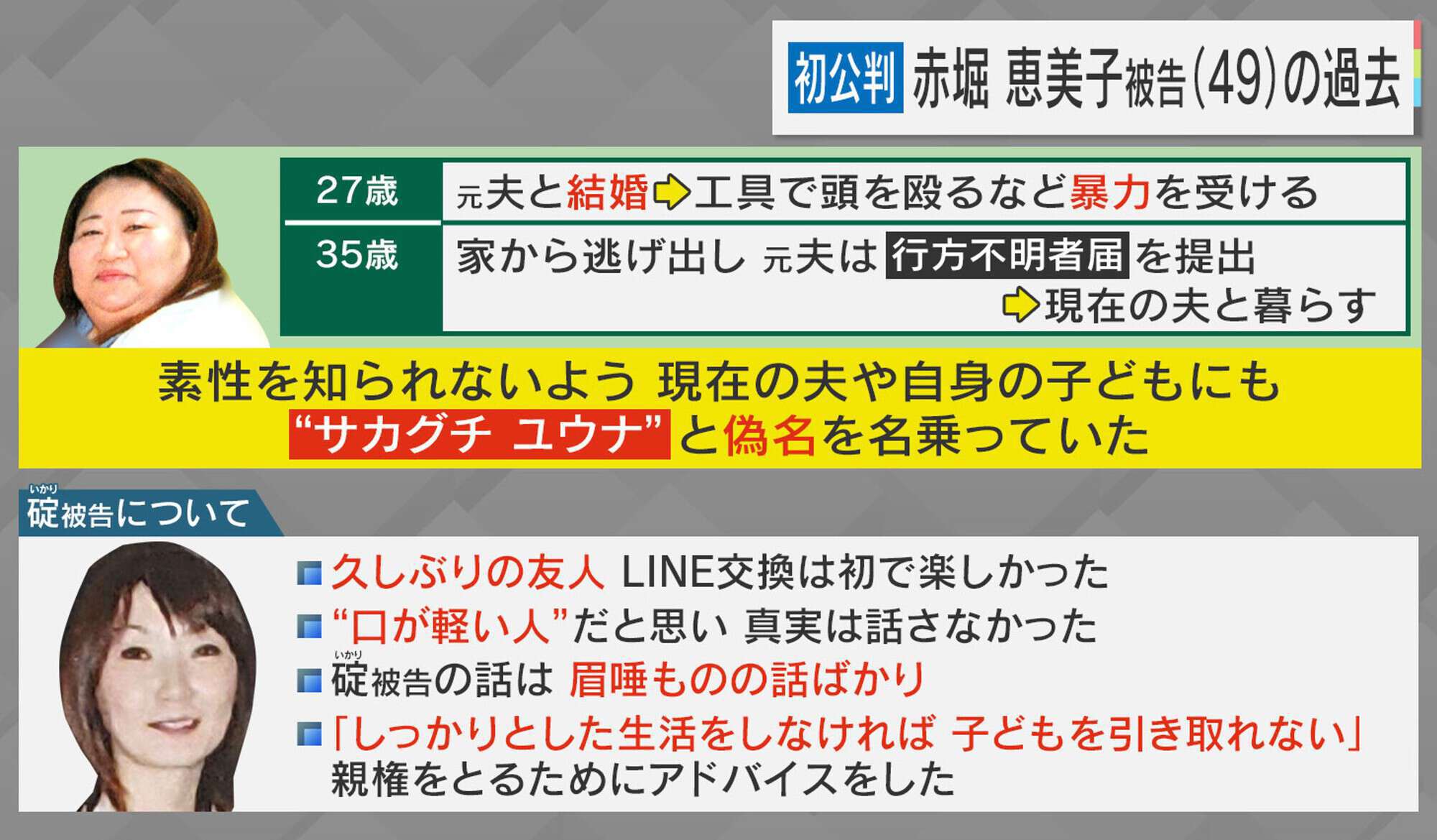 検察側の冒頭陳述では、「赤堀被告は様々な嘘をついて、碇被告の生活を実質的に支配して、子どもたちの食事を制限するなどし、翔士郎ちゃんを餓死させた」と指摘しました。その一方で、弁護側の冒頭陳述では、そのイメージを覆すような赤堀被告の過去が明らかになりました。赤堀被告は27歳で結婚、そのときの夫から激しい暴力を受けていたため、35歳の時に家から逃げるように出て、今の夫と結婚。身元を隠すため、今の夫や自身の子どもに対しても偽名を使っていたということです。「暴力を受けていた夫から逃げる生活を続けていた中で碇被告と出会い、非常に親しい間柄になって、LINE交換したのも赤堀被告にとっては初めての経験だった。赤堀被告は、碇被告の夫に対しての不満や悩みを聞いていた側で、碇被告が公判で話すことは眉唾ものだ」と主張しています。