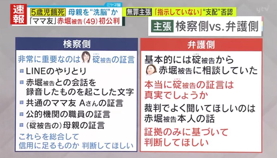 これに対し検察側は、「非常に重要なのは、碇被告の証言だ。LINEのやり取り、赤堀被告との会話を録音したものを起こした文字、共通のママ友Aさんの証言、公的機関の職員の証言、碇被告の母親の証言、これらを総合して信用に足るものか判断してほしい」と主張しています。一方の弁護側は、「本当に碇被告の証言は真実でしょうか。裁判でよく聞いてほしいのは、赤堀被告本人の話。証拠のみに基づいて判断してほしい」とし、主張が対立しています。