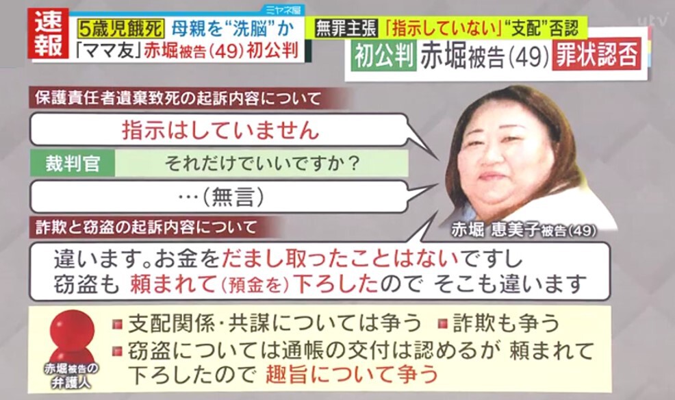 8月29日に行われた初公判で赤堀被告は、保護責任者遺棄致死について、「指示はしていません」と否認。また、碇被告から約200万円をだまし取るなどした詐欺と窃盗の罪についても、「お金をだまし取ったことはないですし、窃盗も頼まれて下ろしたので、そこも違います」と起訴内容を否認し、全面的に争う姿勢を見せました。