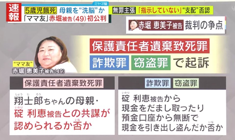今回赤堀被告は、保護責任者遺棄致死罪、詐欺罪、窃盗罪で起訴されています。保護責任者遺棄致死については、翔士郎ちゃんの母親・碇被告との共謀が認められるか否かが争点となります。そして詐欺・窃盗については、現金をだまし取ったり、預金口座から無断で現金を引き出して盗んだか否かが争点です。