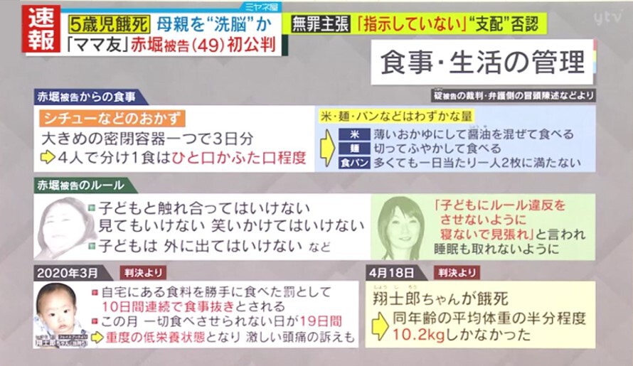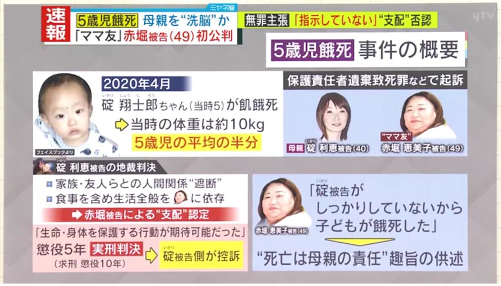 十分な食事を与えず放置し死亡させたとして、母親の碇利恵被告とその「ママ友」の赤堀恵美子被告が、保護責任者遺棄致死罪などで起訴されました。碇被告は、「ママ友」として知り合った赤堀被告に家族や友人らとの人間関係を遮断され、食事を含め、生活全般を赤堀被告に依存していたといいます。碇被告の裁判の地裁判決では、「判断能力も低下していた中、赤堀被告の指示に従わざるを得ないと考えた」と、赤堀被告による“支配”が認定されましたが、碇被告に「生命・身体を保護する行動が期待可能だった」として、2022年6月、福岡地裁で懲役5年の実刑判決が下されました。碇被告側は福岡高裁に控訴していて、減刑を求める方針です。