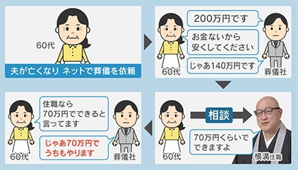 以前から交流があった住職に相談したところ、「うちでやれば70万円くらいでできますよ」と話があったので、それを葬儀社に伝えると、「じゃあ70万円でうちもやります」と言ったといいます。