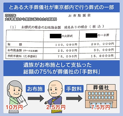 大手葬儀社から僧侶に配られた内部資料を入手しました。とある大手葬儀社が東京都内で行う葬式の一部に関するもので、『お布施額表』と書かれています。火葬式の総額10万円のお布施のうち、僧侶が受け取る『お布施金額』は2万5000円で、葬儀社の『手配手数料』が7万5000円と書かれています。
