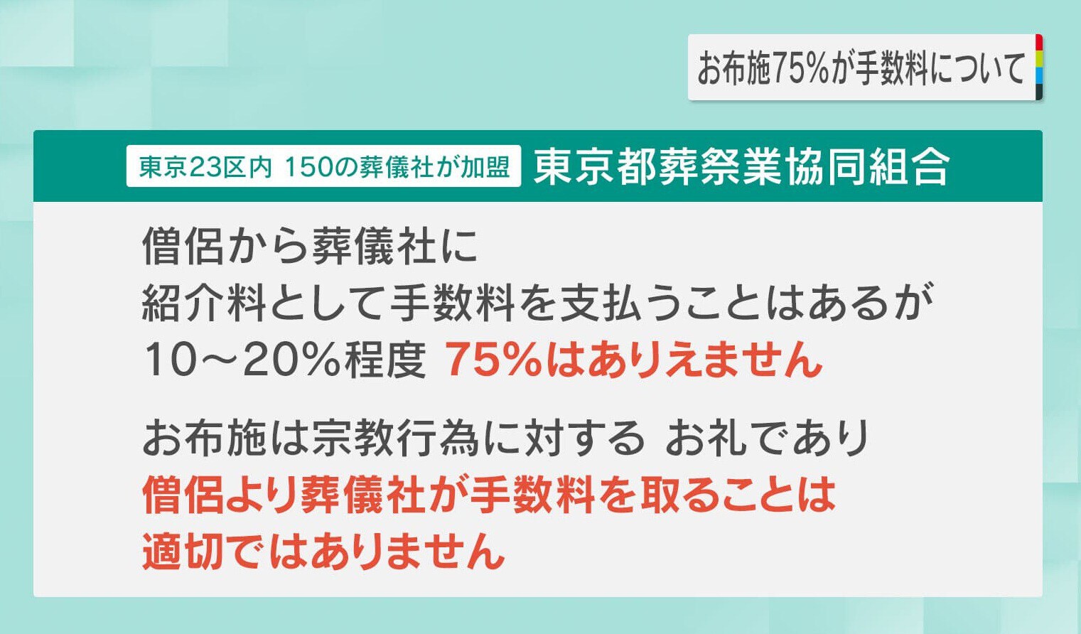 東京23区内、150の葬儀社が加盟する『東京都葬祭業協同組合』によると、「僧侶から葬儀社に紹介料として手数料を支払うことはあるが、10%~20%程度で、75%はありえません。お布施は宗教行為に対するお礼であり、僧侶より葬儀社が手数料を取ることは、適切ではありません」ということです。