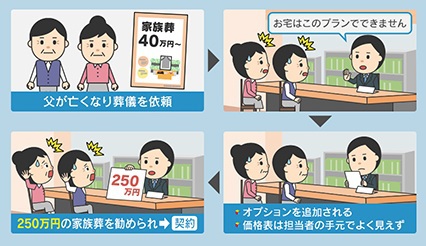 ケース①父親が亡くなり、“家族葬40万円~”と広告を出していた葬儀社に依頼したところ、「お宅はこのプランではできません」と言われました。そこでオプションを追加され、さらに価格表は担当者の手元でよく見えなかったということです。広告では“40万円~”となっていましたが、結局250万円の家族葬を勧められ、仕方なく契約をしてしまったということです。