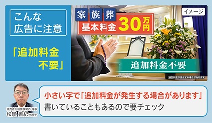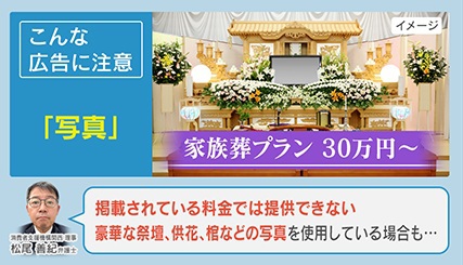 さらに、広告の『写真』にも注意が必要です。「掲載されている料金では提供できない豪華な祭壇、供花、棺などの写真を使用している場合もある」ということです。