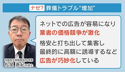 消費者支援機構関西理事・松尾善紀弁護士によると、「ネットでの広告が容易になり、業者の価格競争が激化している。格安と打ち出して集客し、最終的に高額に誘導するなど、広告が巧妙化している」ということです。