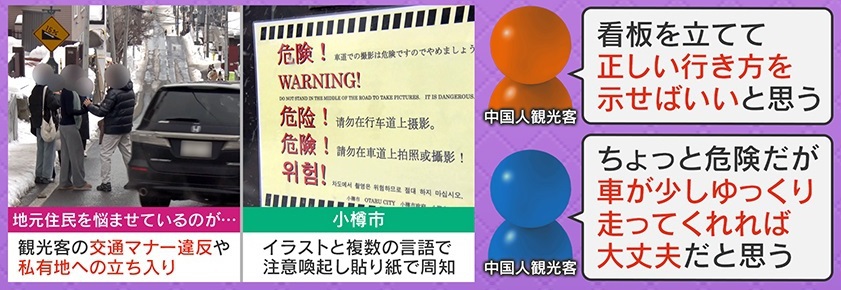 また、地元住民を悩ませているのが、観光客の交通マナー違反や私有地への立ち入りです。小樽市内の『船見坂』では、車道に出て写真撮影する人が跡を絶ちません。小樽市はイラストと複数の言語で注意喚起し、貼り紙で周知していますが、中国人観光客は取材に対し、「看板を立てて、正しい行き方を示せばいいと思う」「ちょっと危険だが、車が少しゆっくり走ってくれれば大丈夫だと思う」と話していました。