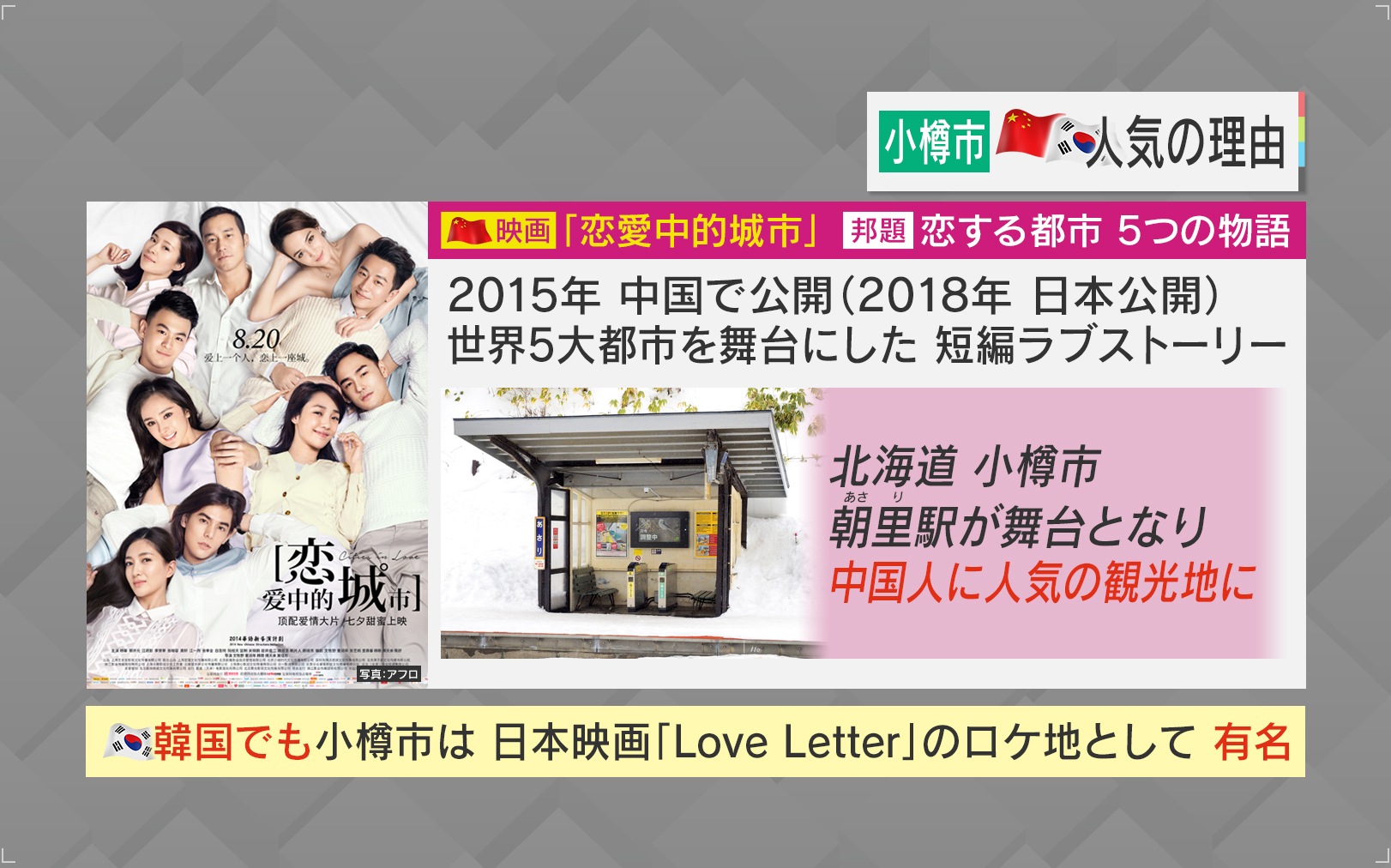 2015年に中国で公開された映画『恋愛中的城市(邦題:恋する都市 5つの物語/2018年日本公開)』は、世界5大都市を舞台にした短編ラブストーリー。そこのロケ地として中国人観光客に人気なのが、北海道小樽市のJR朝里駅です。また、小樽市は日本映画『Love Letter』のロケ地として、韓国でも有名だということです。